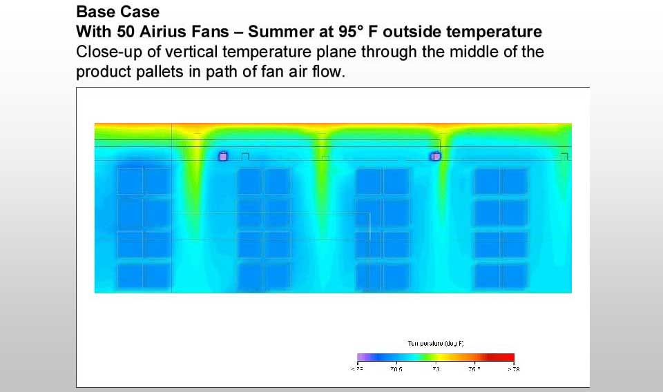 The elevation graphic shows a complete equalisation of temperature around the pallet racks supporting literally billions of dollars of inventory from floor to ceiling meeting FDA regulations and approval.