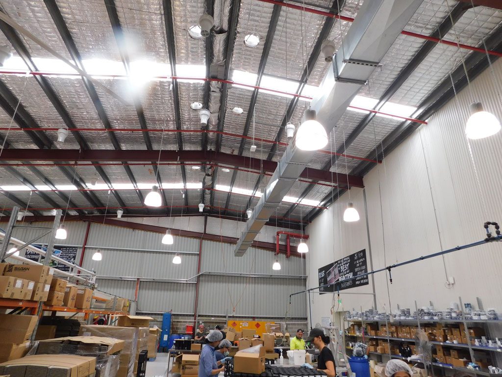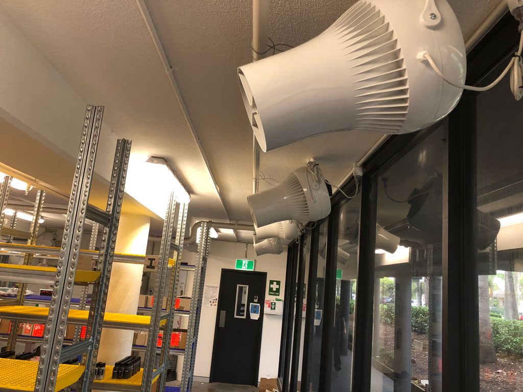 For the aisles, the units were mounted horizontally just above head height and pointed to blow directly down between the product storage racks.