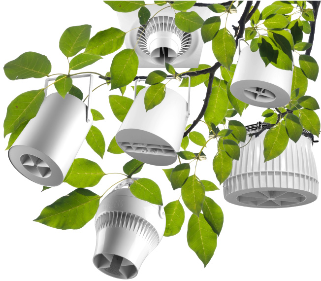 Old style ceiling fans or a simple tube design generally will not offer adequate throw for destratification. Airius fans feature a unique nozzle design and patented stator system to ensure that a laminar non-turbulent column of air is delivered from ceiling to floor — where we live and work. With any axial fan, there exists a radial component to the air flow causing it to spread laterally and lose velocity when leaving the nozzle. Airius’ patented fixed blade stator sits below the fan to transfer this rotational energy into linear motion exiting the nozzle. Having the airflow energy in line with the fan axis promotes a tight air column and maximizes the throw. In addition to the stator, the slightly tapered nozzle increases the exit speed and allows for the air throw to be maximized even further.