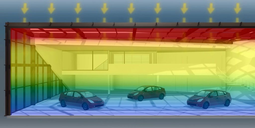 This stratification effect can be seen in this illustration and is very common in buildings of this nature.