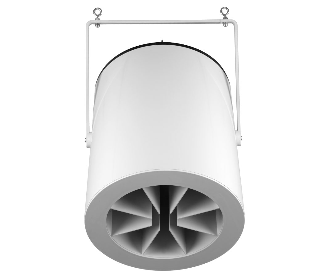 Our internationally-patented Multi-Vane Stator and Venturi Nozzle technology transfers rotational energy to create a slow-moving columnar laminar airflow. This innovative design increases throw distance and entrainment while reducing energy consumption.